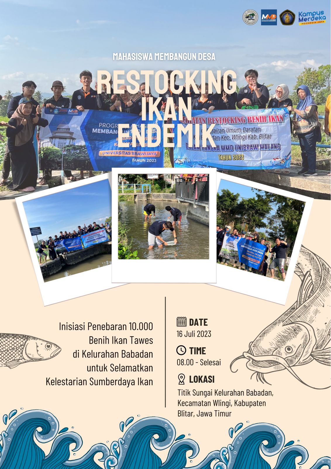 Blitar (16/07/2023)– Sebanyak 14 mahasiswa yang sedang melakukan kegiatan MMD-1000 Desa di Kelurahan Babadan, Kecamatan Wlingi, Kabupaten Blitar, telah berhasil menginisiasi kegiatan penebaran benih ikan endemik, yakni Ikan Tawes (Barbonymus gonionotus), di beberapa titik di sungai Kelurahan Babadan. Pada hari Minggu, 16 Juli 2023, sekitar pukul 08.00 WIB. Kegiatan ini dilaksanakan dengan semangat tinggi. Kehadiran beberapa tokoh masyarakat, seperti Ketua RT setempat, Babinsa Kelurahan Babadan, perangkat Kelurahan, relawan pelestari sumberdaya ikan, dan masyarakat sekitar, turut memberikan dukungan pada kegiatan ini. Latar belakang dilakukannya kegiatan ini adalah karena adanya kekhawatiran akan banyaknya jumlah sungai dan pemancing di daerah Kelurahan Babadan yang melakukan kegiatan memancing secara ilegal, seperti menggunakan setrum dan bom ikan. Praktik ilegal ini menyebabkan ancaman serius terhadap kelestarian sumberdaya ikan di Kelurahan Babadan, termasuk ikan ukuran kecil dan telur-telur ikan.