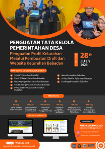 Blitar (28/07/2023) – Kelurahan Babadan bersinergi dengan Tim MMD-1000 Desa Universitas Brawijaya Kelompok 351 yang menginisiasi untuk mengaktifkan kembali website Kelurahan Babadan demi upaya untuk memberikan informasi yang relevan dan bermanfaat untuk masyarakat. Di dalam website kelurahan ini dimuat banyak informasi seperti sejarah kelurahan, profil kelurahan, pemerintah kelurahan, artikel berita, syarat-syarat dokumen pelayanan dan galeri kelurahan.